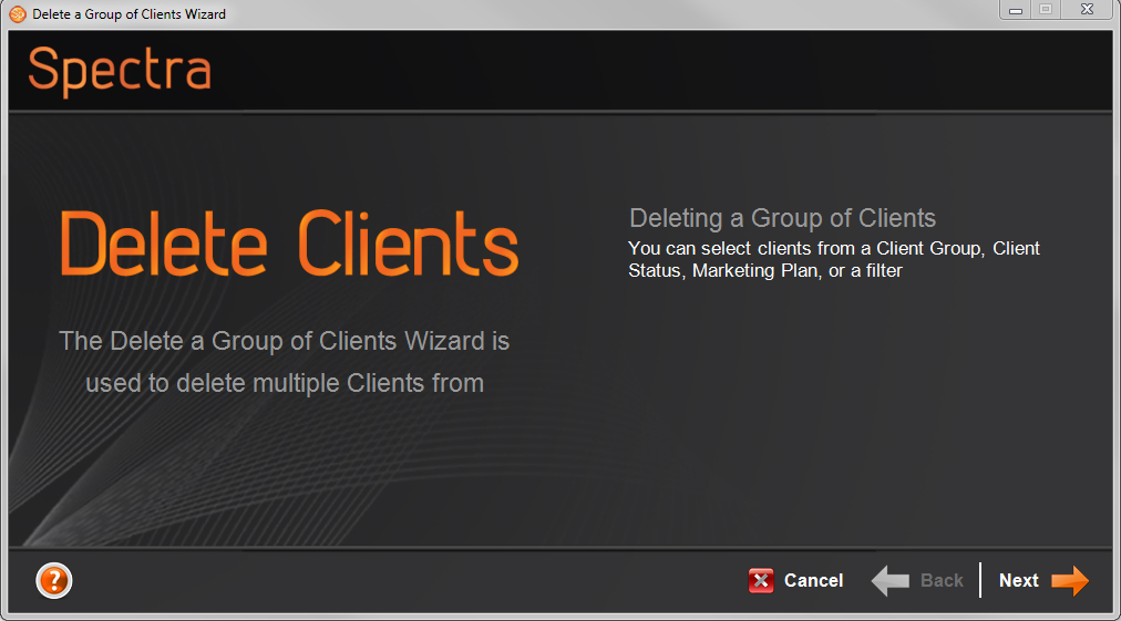 The Delete Clients Wizard will launch. Click Next to begin, or click Cancel to quit the wizard.