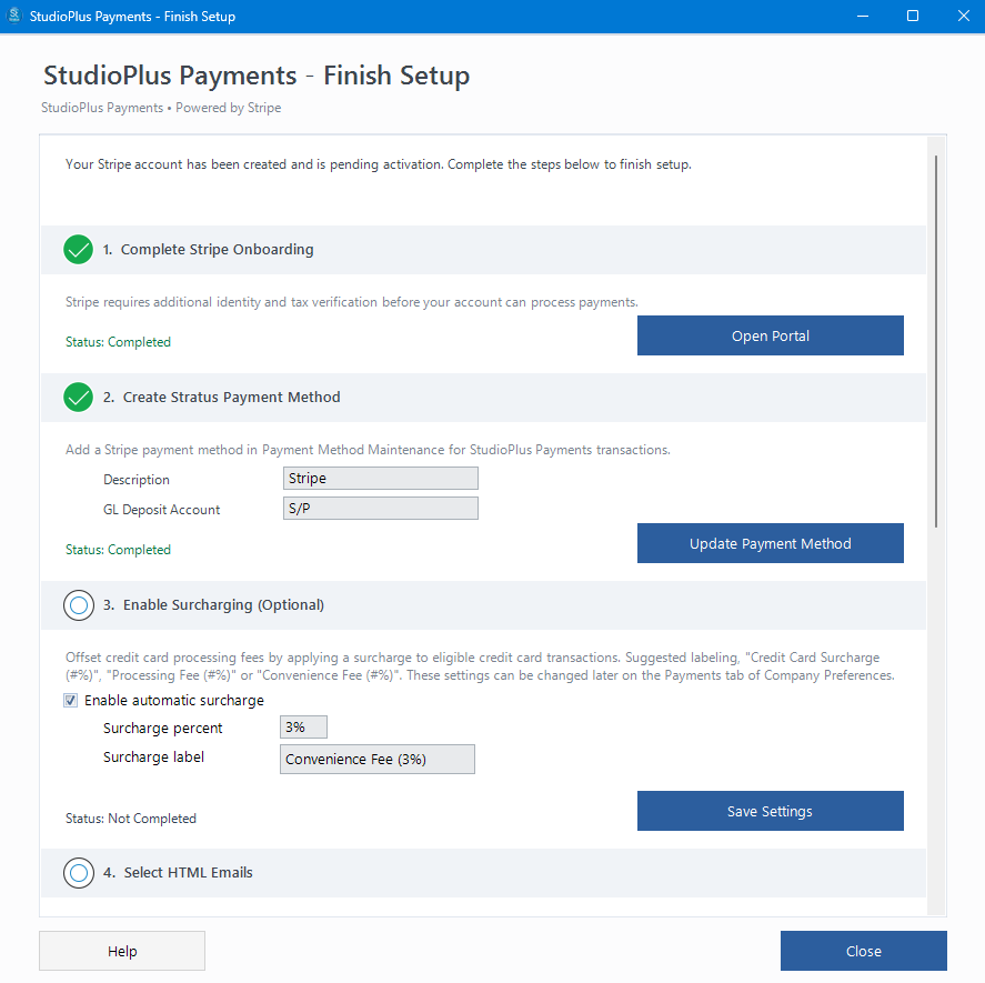 After filling out Stripe's onboarding information, return to Stratus' "checklist" to finish the remaining steps to get started with StudioPlus Payments.