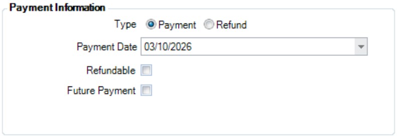 In the Payment Information section, the Type setting controls whether this record is a payment or a refund.