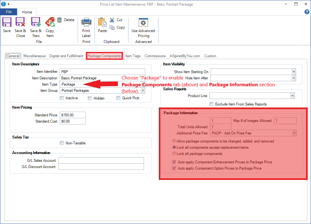 Item Type - Choose "Package" as the item type. Notice that this selection "turns on" a new Package Information section on the General tab as well as a new Package Components tab (see screen shot above). You'll complete those sections in steps 5 and 6 below.