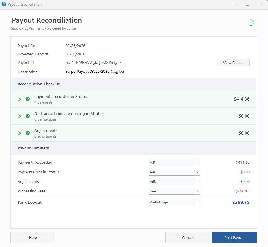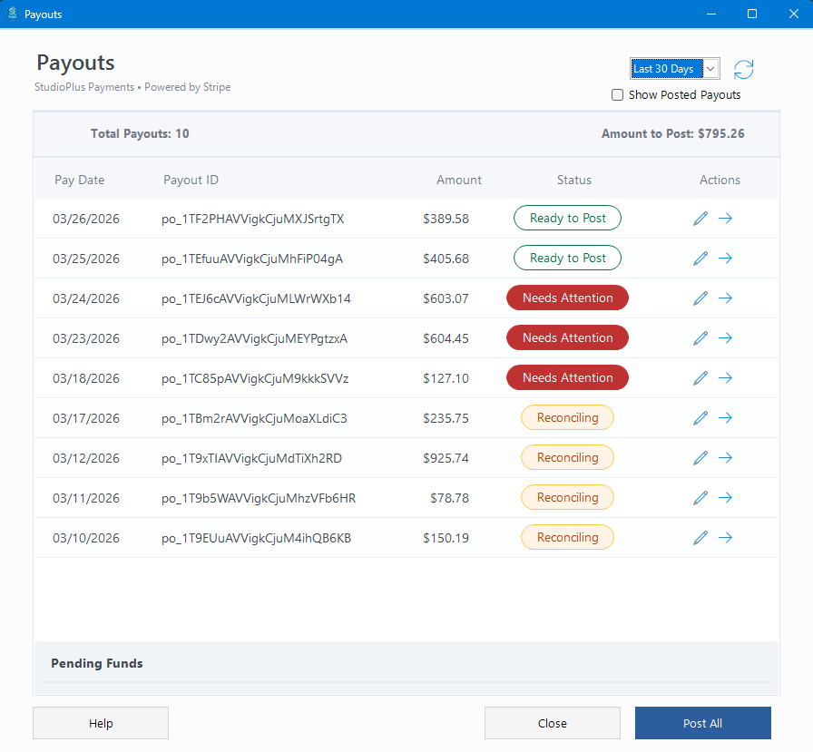 When this window first opens, Stratus automatically compares its records with Stripe. Your payouts will show as Reconciling while this review is still in progress. Select Show Posted Payouts to view payouts that were already posted.
