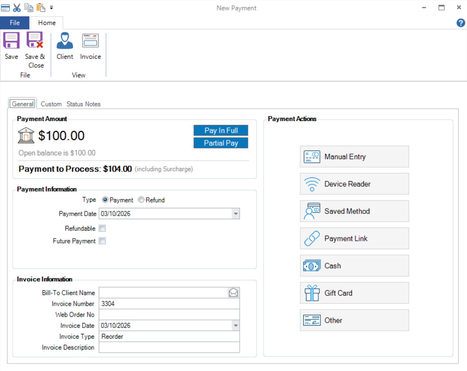 In the Payment Information section, the Type setting controls whether this record is a payment or a refund.