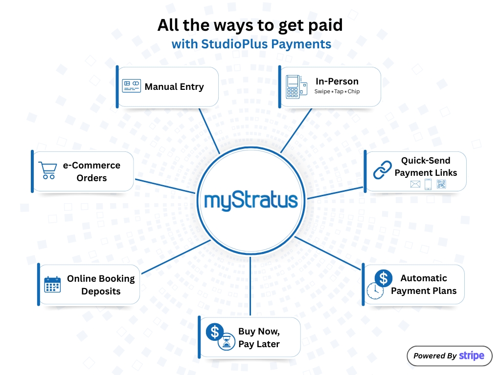 StudioPlus Payments is myStratus’ newest payments integration, powered by Stripe. It connects to existing myStratus workflows while adding a more modern checkout experience and more flexible ways to collect card payments.