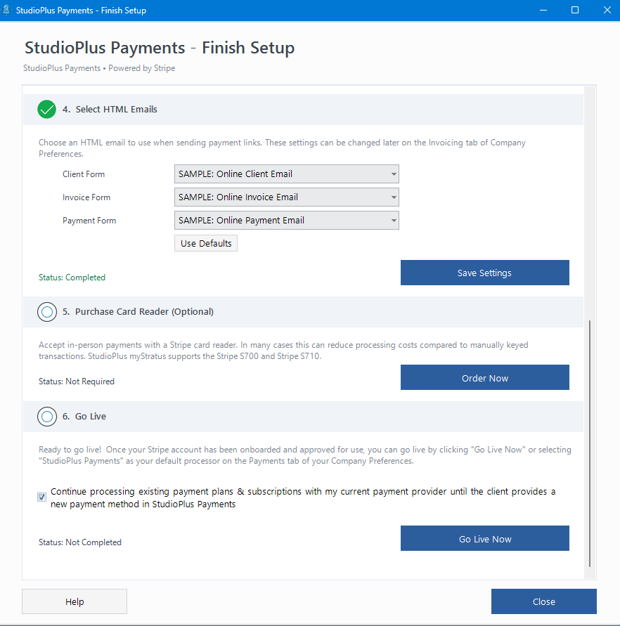 After filling out Stripe's onboarding information, return to Stratus' "checklist" to finish the remaining steps to get started with StudioPlus Payments.